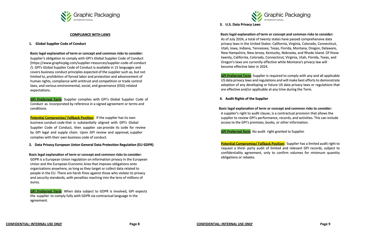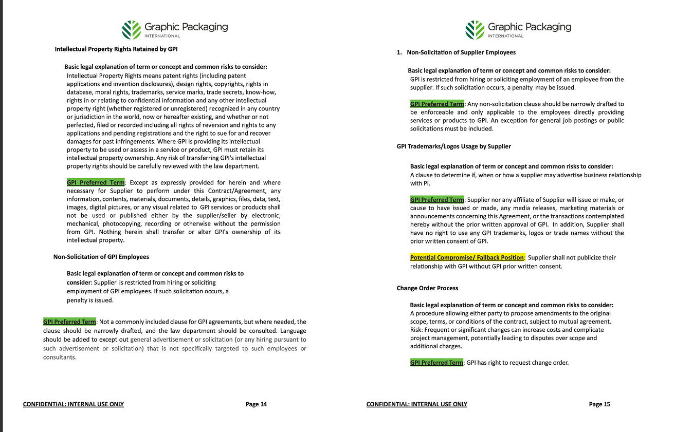 By aligning suppliers with GPI Preferred Terms, the contracting process becomes faster, and risk exposure is minimized. The playbook clearly identifies unacceptable supplier language, allowing negotiators to address issues promptly.