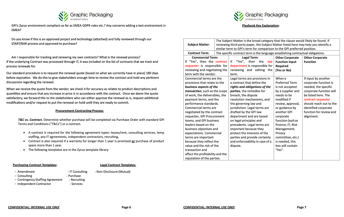 Graphic Packaging International (GPI) aims to implement a consistent and uniform approach to supplier contracts to mitigate organizational risks and allow the law department to prioritize contract review based on potential issues. The use of a detailed contract playbook enables negotiators to apply established positions confidently, respond efficiently to supplier redlines, and reduce time spent on back-and-forth negotiations.