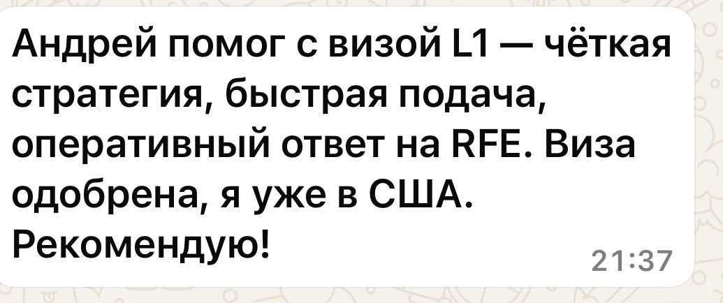 У 2024 році адвокат Андрій Солодов, експерт з імміграційного права США, надав комплексну юридичну підтримку клієнту, якого переводили з головного офісу компанії за кордоном до американського філіалу з метою розвитку бізнесу. Супровід охоплював усі етапи — від попереднього аналізу, підготовки доказів і документів, подання петиції до USCIS з використанням преміум-процесингу, до отримання схвалення і фактичного переїзду до США.